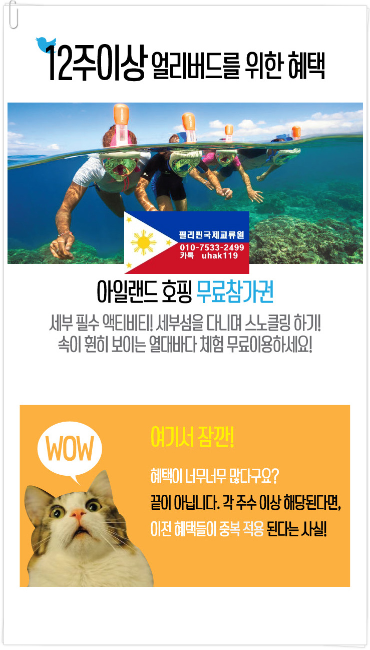 12주 등록시 : 인천 / 김해 - 세부 왕복 항공권 제공, 호핑 아일랜드 이용권 제공