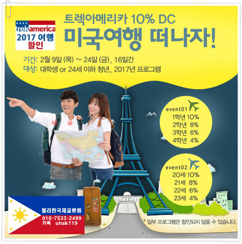 대학생을 위한 미국 횡단 다국적 영어 여행 10% 할인 여행 이벤트 대학생과 24세이하 청년을 위한 트렉아메리카 10% 미국 여행 할인 이벤트 이벤트 기간 : 2017년 2월 9일 - 2월 24일까지 필리핀국제교류원 학생들을 위한 미국 다국적 영어여행 이벤트 일부 여행상품은 할인 혜택이 제공되지 않습니다. 미국 다국적 영어 여행 트렉아메리카 문의 필리핀국제교류원 070-7533-2499 / 010-7533-2499 / 카톡 uhak119
