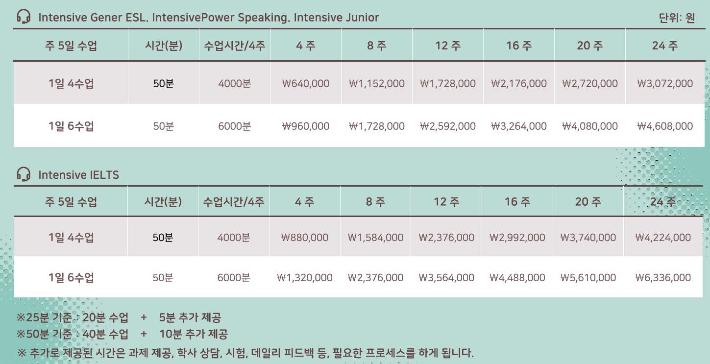 인텐시브 영어회화 - 15세 이상 / 1일 4타임, 6타임 / 주5일 / 50분 수업