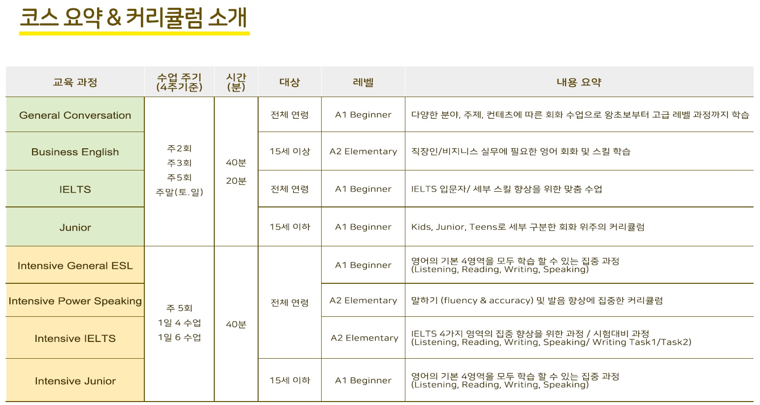 인텐시브 주니어 - 15세 이하 / 1일 4타임, 6타임 / 주5일 / 50분 수업