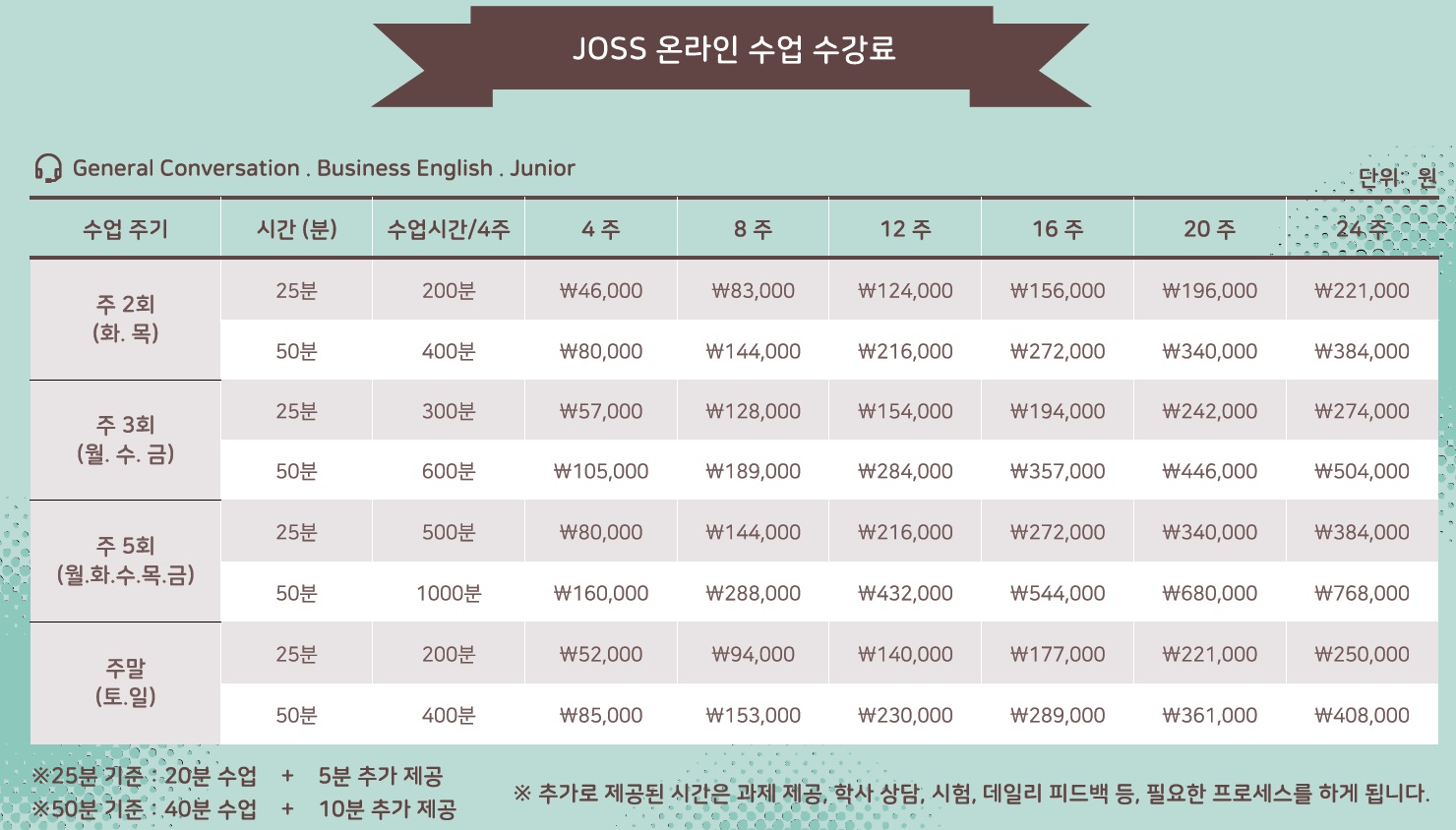 주니어 - 15세 이하 / 주 2회, 3회, 5회 / 25분, 50분 수업