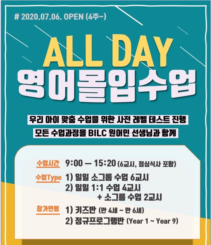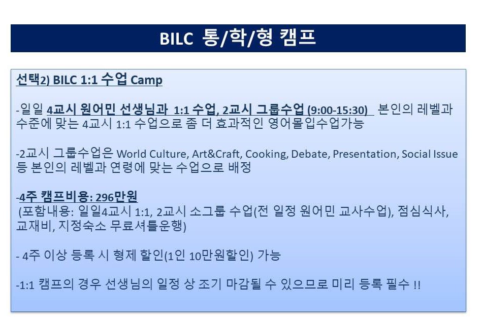 아이 혼자 오는 영어캠프와 부모님과 함께 오는 통학형 주니어어학연수가 가능한 BILC어학원입니다.