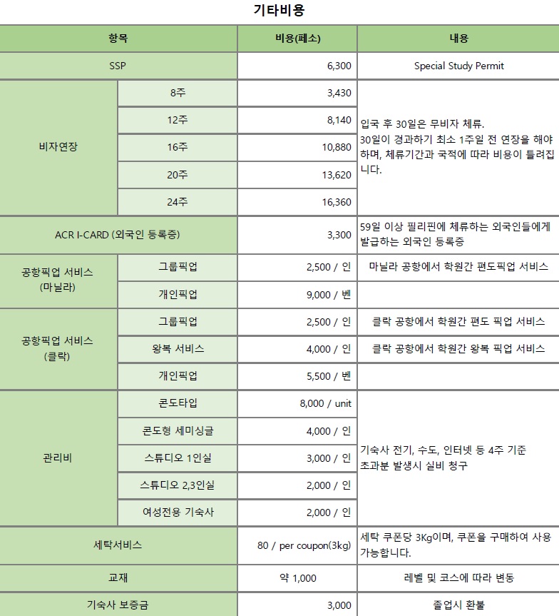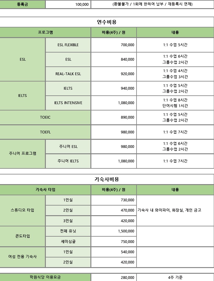 제한기준 : 8주 이상 등록 (수업+기숙사+학원식당)을 이용하는 학생