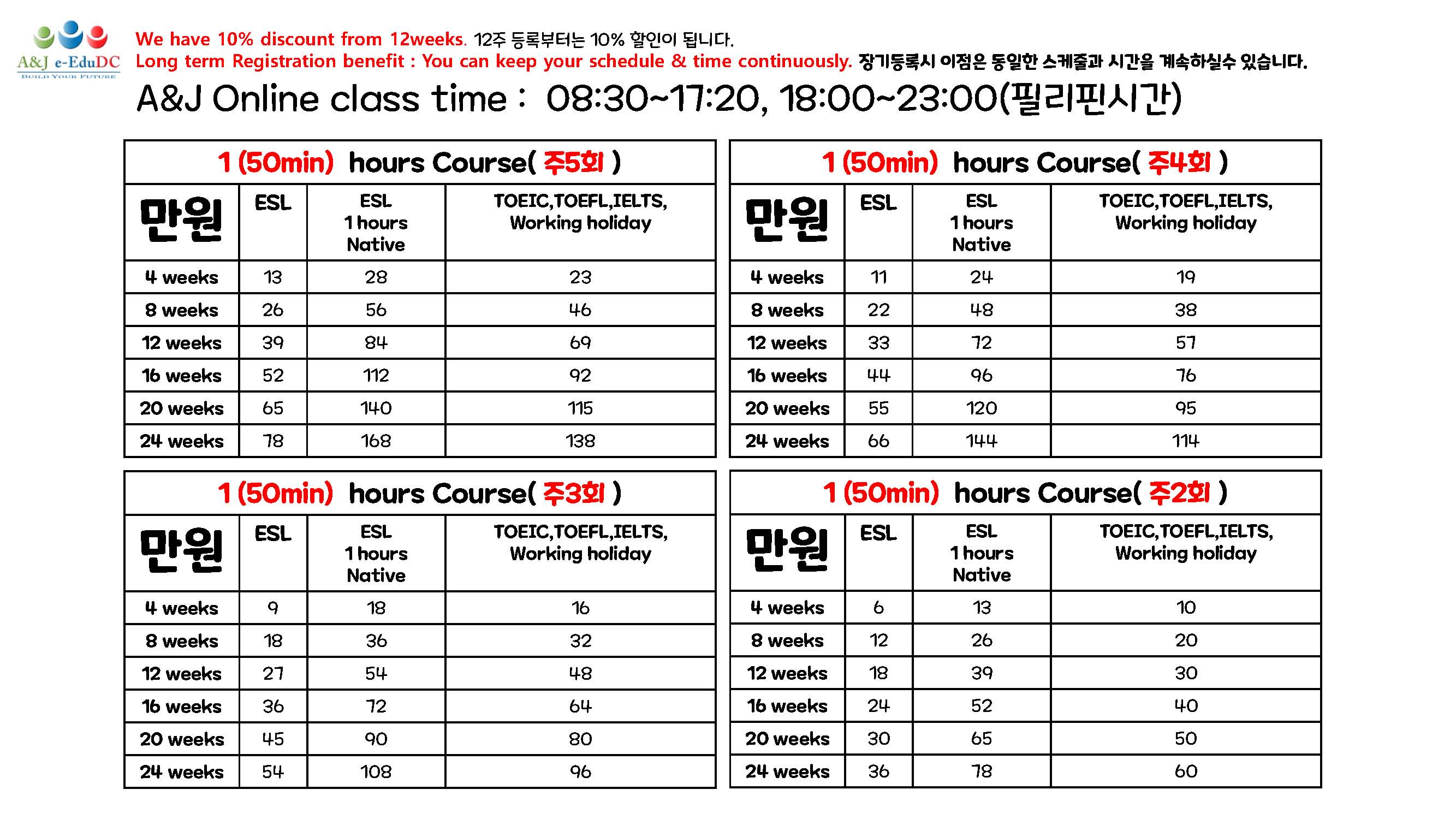 수업 : 50분수업부터 8시간까지 수업 시간 선택 가능
