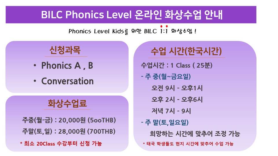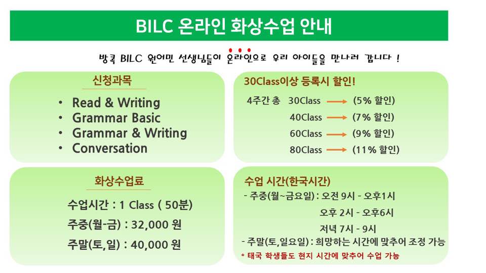태국 방콕 방나에 거주하는 분들은 BILC어학원에서 수업 가능합니다.