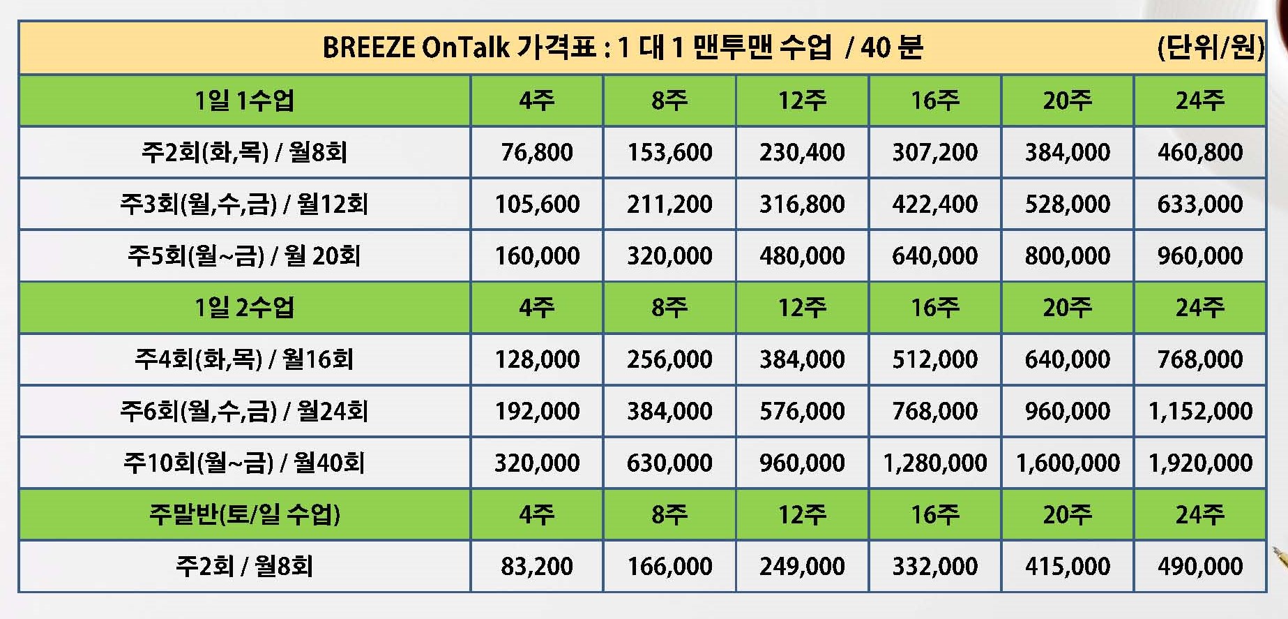 주 2회 / 3회 / 5회 40분 수업 1타임 2타임 선택 가능