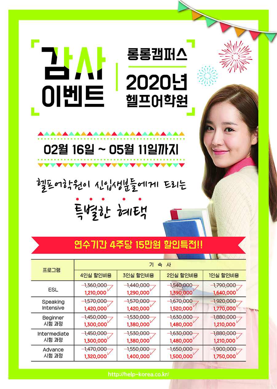 출국일 : 2020년 2월 16일 - 5월 11일까지 출국자에게 4주당 15만원 학비 할인 혜택