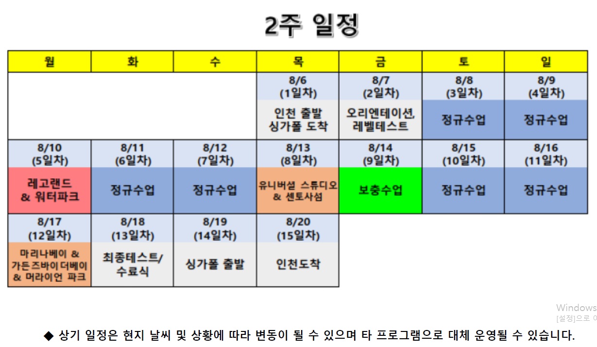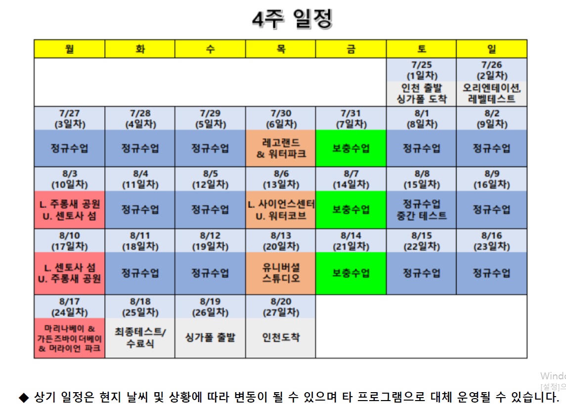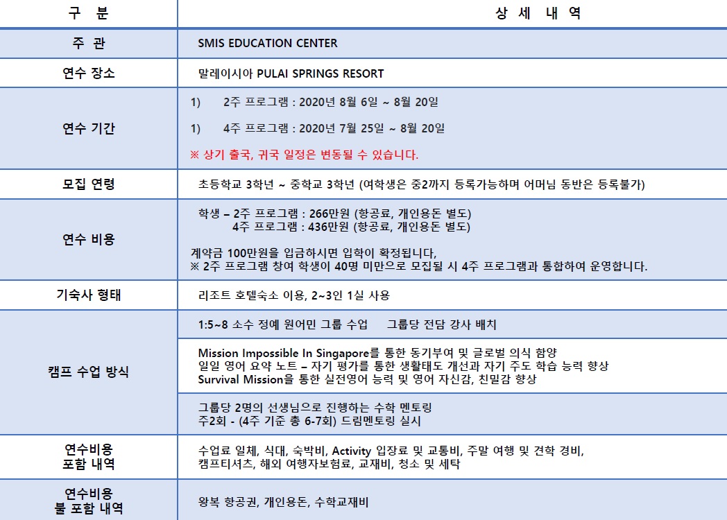 불포함 비용 : 왕복항공료, 개인용돈, 수학교재