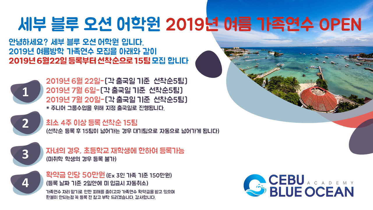 필리핀 세부 세부블루오션어학원 가족연수 2019년 여름 등록 안내