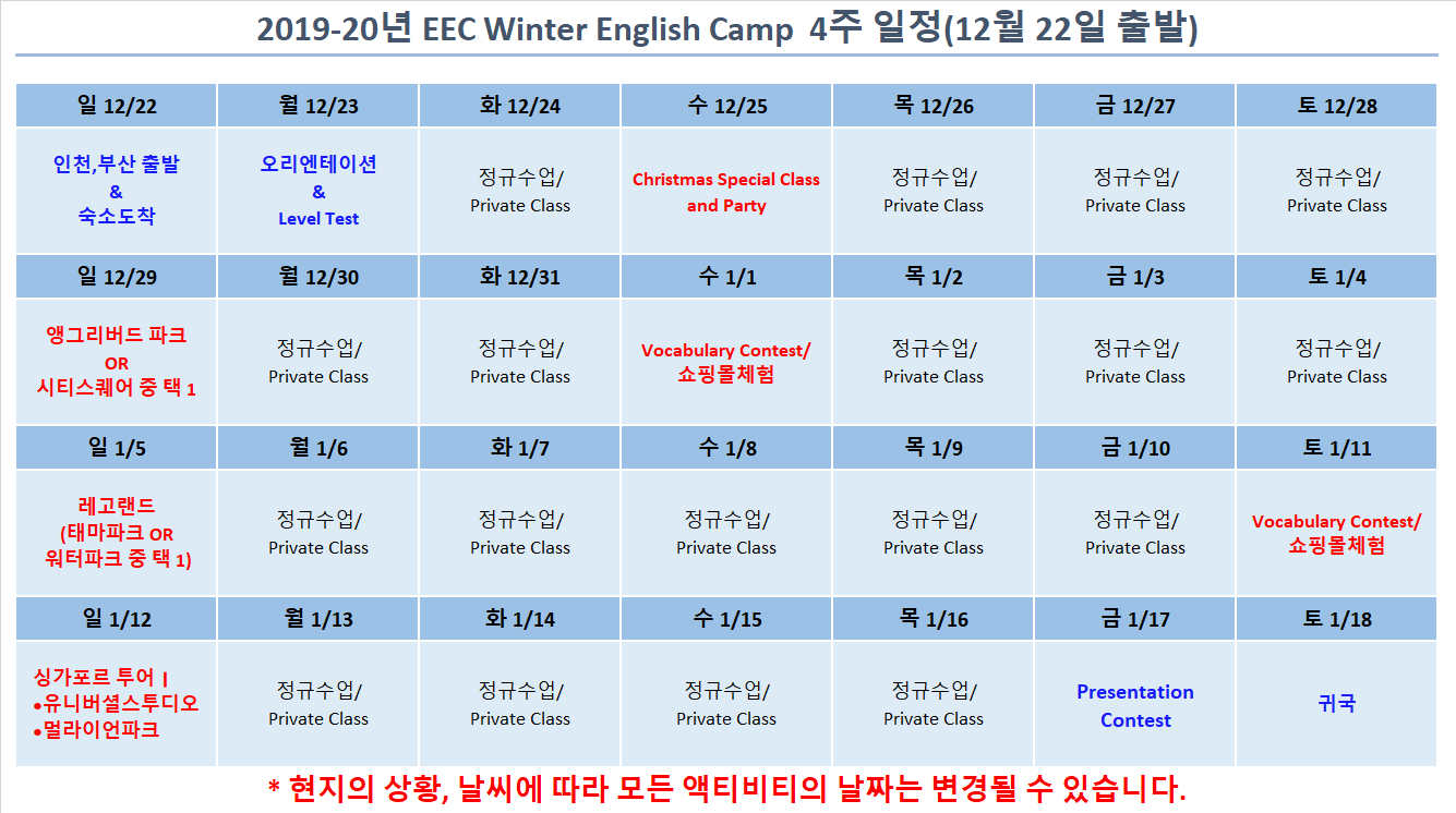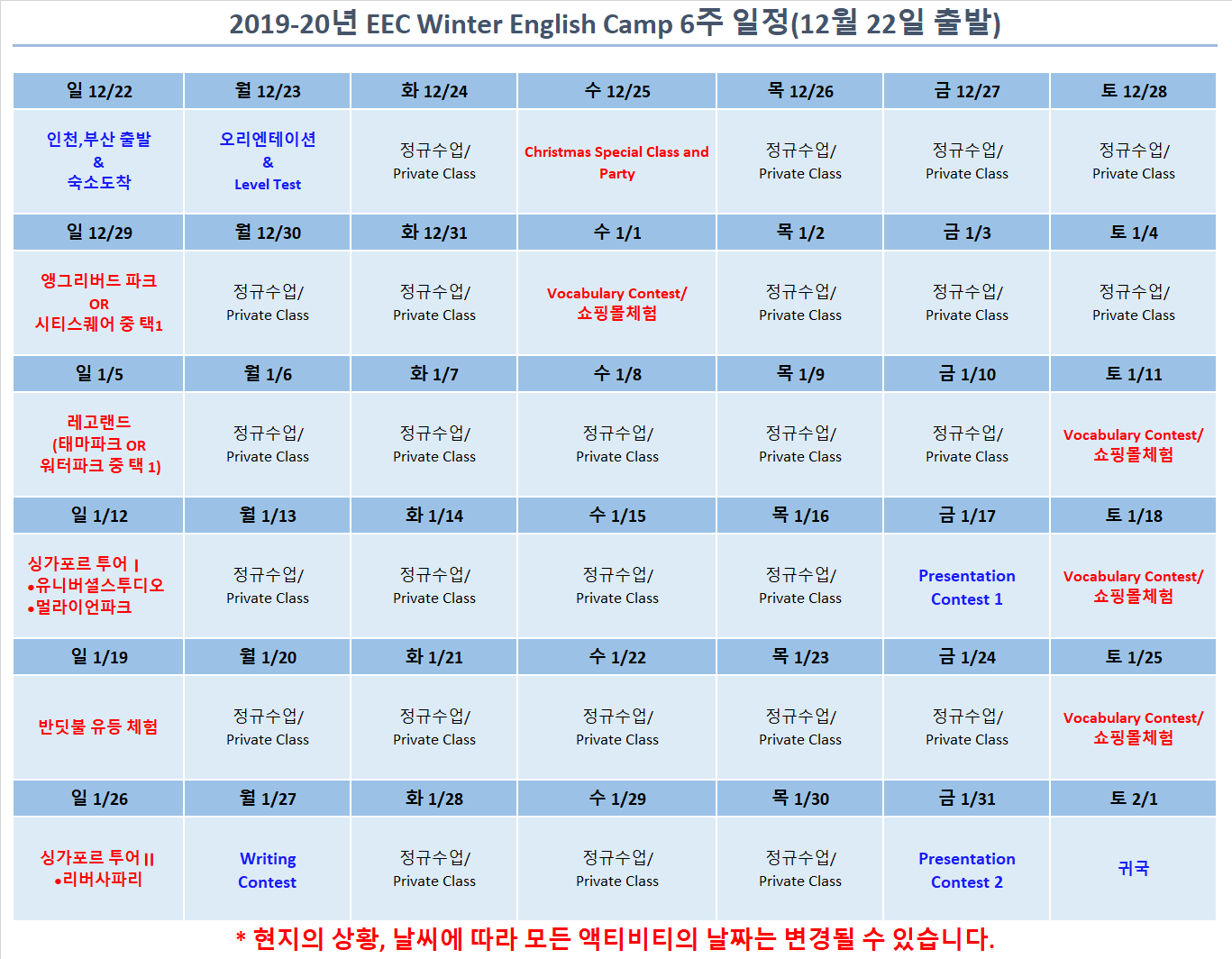 2019년 12월 22일 - 2월 1일 6주 영어캠프 비용 600만원 (항공권 포함)