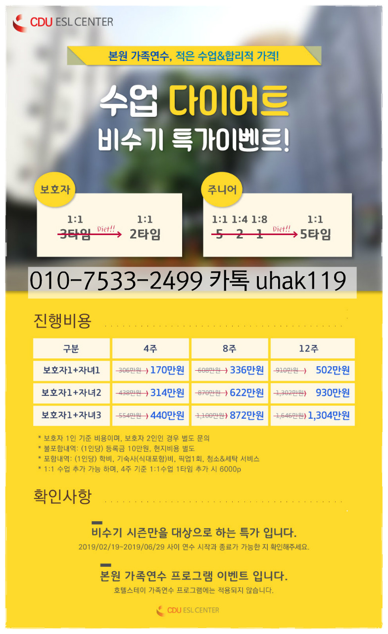 대신 연수기간은 2019년 2월 19일부터 6월 29일에 할인 혜택을 받으시고 그 이후에는 비용이 변동됩니다.