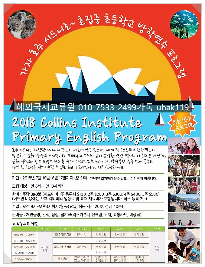 호주 시드니 콜린스 초집중 단기 초등학생 영어캠프 가족연수 (엄마 동반 가능)