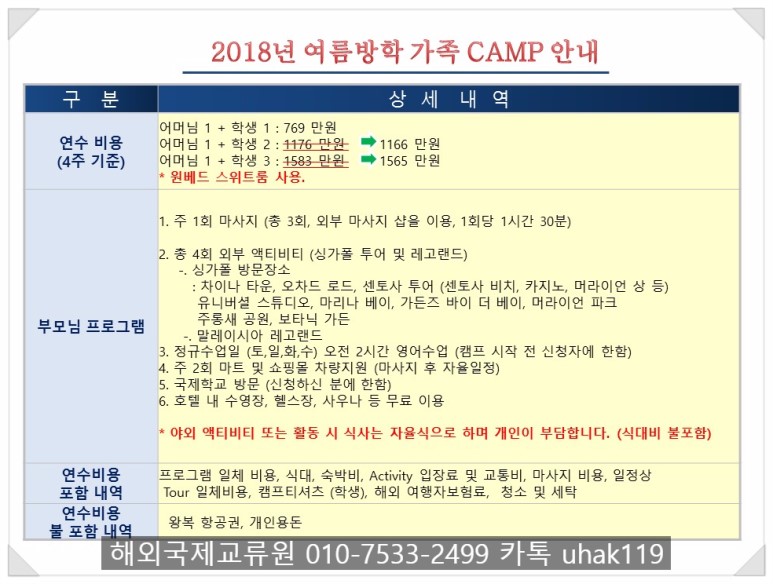 영어캠프 비용  :  엄마와 학생 1명  2인 비용    769만원