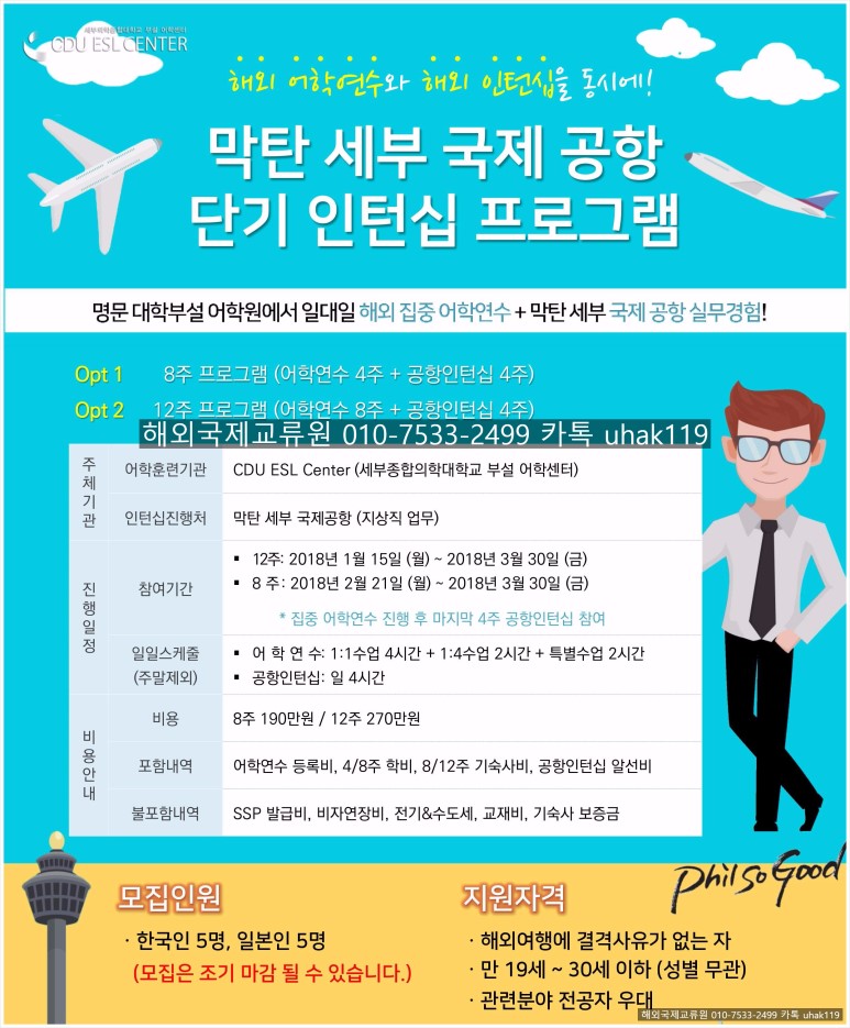 필리핀 세부 cdu대학교 부설 어학원에서 영어수업  4주 또는 8주 어학연수 후 세부공항 지상직업무로 4주간 현장실습을 하게 됩니다.