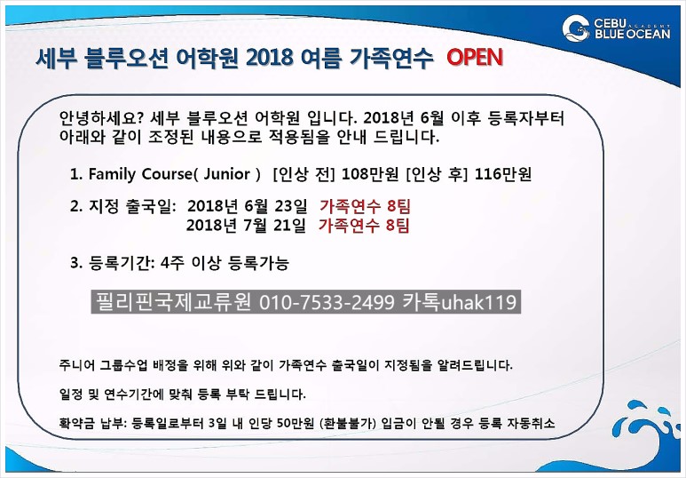 세부블루오션아카데미 어학원 여름 가족연수 등록일자