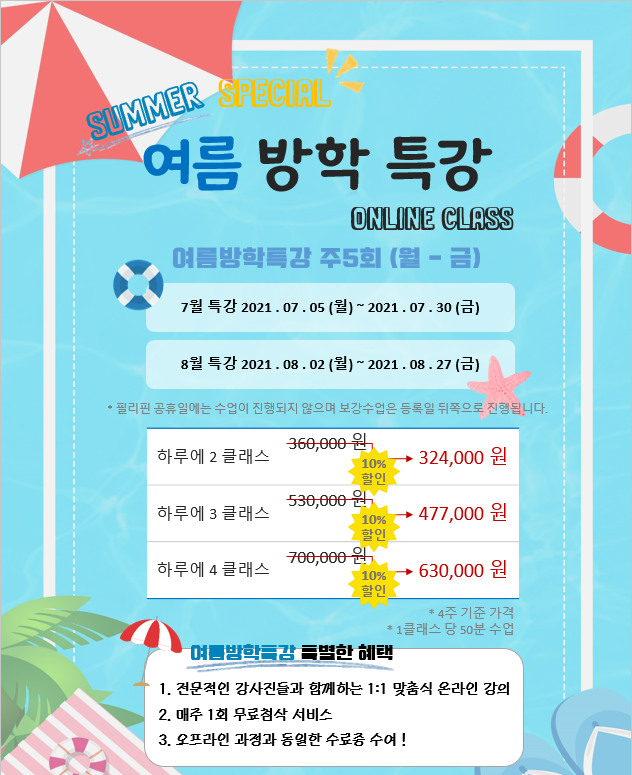 필리핀 세부 셀라어학원 온라인 화상영어 영어캠프 등록 10%할인 혜택 제공