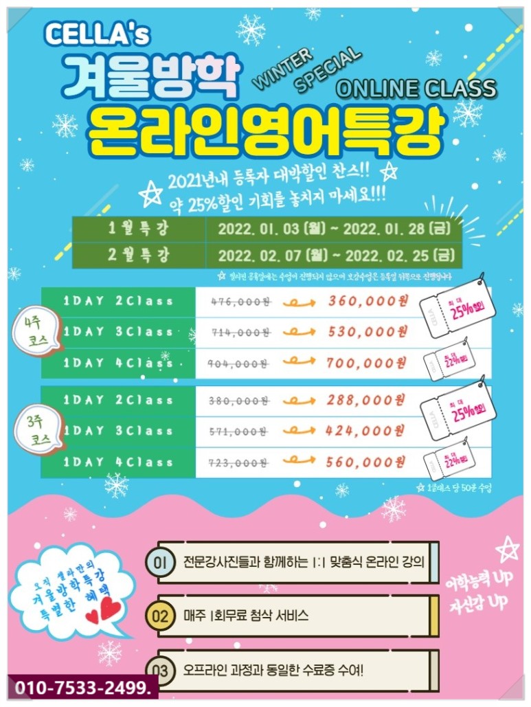 겨울방학 동안 영어실력을 빨리 늘리고 싶다면 셀라어학원 온라인 일대일 줌 화상영어캠프 추천합니다.