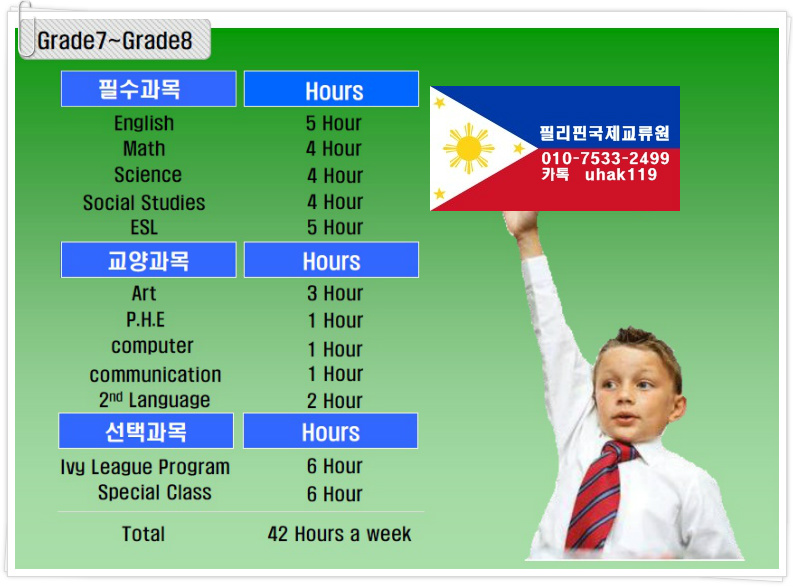 일반 필리핀학교에서 배우는 따갈로그 수업이 없으며 해외 대학교 입학을 준비하는 수업과 교재 사용합니다.
